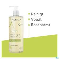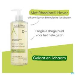 Het dermatologisch laboratorium A-DERMA, expert in de hygiëne van de fragiele huid, komt met deze douchegel op plantaardige basis tegemoet aan de behoeften van de droge huid. Deze wasverzorging, met 90% natuurlijke ingrediënten**, reinigt mild, voedt en beschermt. Verrijkt met natuurlijke emolliënten. Hij ontleent zijn doeltreffendheid en zijn verzachtende en vetinbrengende eigenschappen aan het innovatieve Clean Care Complex™. Deze combinatie bevat een zachte wasbasis en een compenserend middel, om te reinigen zonder te irriteren of uit te drogen. De smeltende formule, met verzachtend Rhealba® Haverkiemextract, verzacht de huid. De overvette Douchegel is biologisch afbreekbaar*, mild, geschikt voor het hele gezin en kan worden aangebracht op gezicht en lichaam. Onder de douche verandert de gel in een licht geparfumeerd luchtig schuim dat gemakkelijk wordt afgespoeld. De droge huid wordt gevoed***, verzacht**** en beschermd. Rhealba® Haver van biologische teelt. Flacon met 50% gerecycleerd plastic. Vegan Info: zonder ingrediënten van dierlijke oorsprong.* Volgens de OESO-norm 301B** Bevat 90% ingrediënten van natuurlijke oorsprong*** De huid is gevoed bij 97% van de proefpersonen - Resultaat van het onderzoek naar de tolerantie voor gebruik bij kinderen en de doeltreffendheid - 33 proefpersonen**** De huid is verzacht bij 100% van de proefpersonen - Resultaat van het onderzoek naar de tolerantie voor gebruik bij kinderen en de doeltreffendheid - 33 proefpersonen