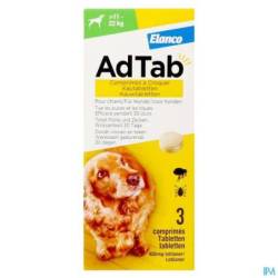 AdTabᵀᴹ is een kleine kauwtablet met vleessmaak voor honden die snel werkt tegen teken en vlooien. Het is een veilig en doeltreffend middel dat al na 4 uur begint te werken. AdTabᵀᴹ is 30 dagen werkzaam.