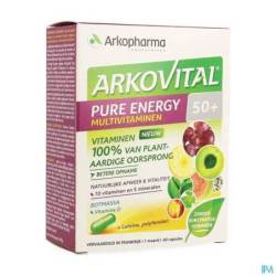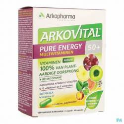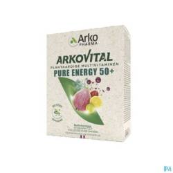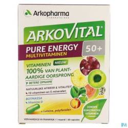 De formule van plantaardige oorsprong van Arkovital® Pure Energy 50+ levert 10 vitaminen en 5 mineralen om u te helpen uw natuurlijke weerstand te versterken en in vorm en vitaal te blijven. Ze helpt ook het botkapitaal te behouden (dankzij vitamine D, zink en mangaan) en het zicht te beschermen (dankzij vitamine B2 en zink).