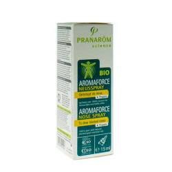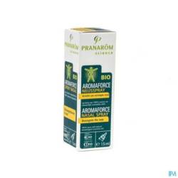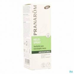 Ontzwellende hypertonische oplossing voor verstuiving in de neus. De Aromaforce neusspray is een hypertonische oplossing met 100 % biologische essentiële oliën. De essentiële oliën van mandravasarotra, zwarte spar, eucalyptus radiata en geranium zijn gekend om hun zuiverende, verfrissende en verzachtende eigenschappen. Dit product wordt gebruikt bij de symptomatische behandeling van neusverstopping, bijvoorbeeld bij rhinitis en rinofaryngitis. Het ontstopt en zuivert de neus door het slijm te verwijderen dat de bron is van bacteriële besmetting en door tegelijk uitdroging van het slijmvlies te vermijden. Het geeft een gevoel van frisheid dankzij de aanwezigheid van essentiële oliën. Aromaforce neusspray leidt niet tot gewenning. Geschikt voor gebruik tijdens de zwangerschap en borstvoeding. CE - dispositif-medical Dit product is een geneesmiddel. Als u meer informatie en advies wenst, kunt u zich tot uw apotheker wenden. Als de symptomen meer dan 10 dagen blijven bestaan, raadpleeg dan uw arts.