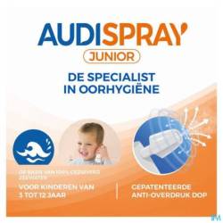 Audispray Junior is een oorspray die speciaal werd ontworpen voor kinderen van 3 tot 12 jaar. Een reiniging waarbij het risico van overdruk op het trommelvlies beperkt wordt, dankzij de gepatenteerd dop!