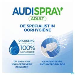 De Audispray-oplossing bestaat uit microbiologisch gecontroleerd zeewater en reinigt de oren doeltreffend en in zachtheid. Dankzij de gepatenteerde dop wordt het risico op overdruk beperkt.