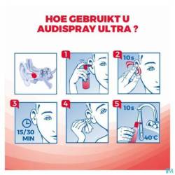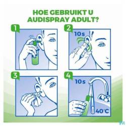 Vanaf 12 jaar: 1 tot 2 verstuivingen per oor, 2 tot 3 keer per week. Bij een overmatige oorsmeerproductie kan Audispray Adult dagelijks gebruikt worden.