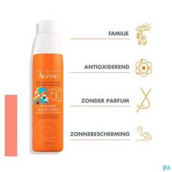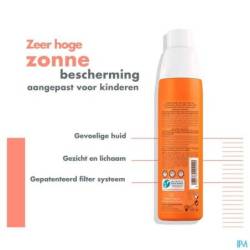 Dankzij zijn nieuwe barrièretextuur tegen agressieve omgevingsfactoren* biedt de SPF50+ Spray kinderen een vloeibare textuur die heerlijk licht aanvoelt bij het aanbrengen, evenals een extra krachtige beschermende film die zeer bestand is tegen water. De SPF 50+ Spray kinderen is ideaal voor de gevoelige kinderhuid. De SPF 50+ Spray kinderen bevat het exclusieve beschermende Sunsitive®-complex, ontwikkeld door Pierre Fabre Research, dat is samengesteld uit: • Een gepatenteerd filtersysteem dat slechts 4 zonnefilters bevat voor een zeer brede en stabiele UVB-/UVA-beschermingen optimale huidtolerantie. • Provitamine E (pre-tocoferyl) met krachtige antioxiderende werking die de cellen beschermt tegen vrije radicalen. • Thermaal Water van Avène dat bekend staat om zijn kalmerende, anti-irriterende en verzachtende eigenschappen. Het is voorzien van een OPEN/STOP-systeem, waardoor het nog praktischer en milieuvriendelijker in gebruik is.
