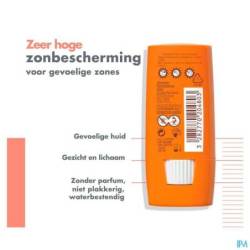 De SPF 50+ Stick voor gevoelige zones is gemakkelijk aan te brengen* en zeer water- en zweetbestendig*. De niet-vettige textuur heeft een transparante finish op de huid*. Dit product beschermt de gevoelige huid van het gezicht en lichaam en is perfect geschikt voor het hele gezin, sportbeoefenaars en vrouwen De SPF 50+ Stick voor gevoelige zones bevat een uniek complex van actieve bestanddelen ontwikkeld door Pierre Fabre Research: • Een stabiel filtersysteem dat een zeer brede UVB-/UVA-bescherming biedt. • Een uniek Antioxidant-Complex (Provitamine E + Thialidine) dat de cellen beschermt tegen oxidatieve stress. De SPF 50+ Stick voor gevoelige zones biedt een erg hoge huidtolerantie die tijdens dermatologische en pediatrische tests geëvalueerd werd.