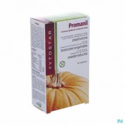 Fytostar Promanil is een totaalcomplex voor de man, met brandnetel, pompoenpitten en sabalvrucht; deze helpt als ondersteuning voor de plasfunctie. De plaspillen bevatten daarnaast zink, dat bijdraagt tot het behoud van een goed testosterongehalte in het bloed en selenium, dat bijdraagt tot het behoud van een gezonde zaadproductie. Bovendien is er vitamine B6 als ondersteuning voor de regulatie van de hormonale activiteit en vitamine E aan toegevoegd.
