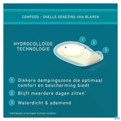 De blarenpleisters van Compeed® zorgen voor onmiddellijke pijnverlichting en een snelle genezing. Het gelkussentje verspreidt de druk op de blaar en neemt tegelijk de wrijving weg. De hydrocolloïdgel in de pleister neemt overtollig vocht op en zorgt voor de beste omstandigheden voor het herstel van de huid.