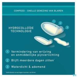 De blarenpleisters van Compeed® zorgen voor onmiddellijke pijnverlichting en een snelle genezing. Het gelkussentje verspreidt de druk op de blaar en neemt tegelijk de wrijving weg. De hydrocolloïdgel in de pleister neemt overtollig vocht op en zorgt voor de beste omstandigheden voor het herstel van de huid.
