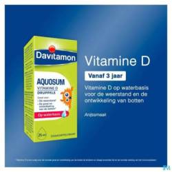Davitamon® Aquosum Vitamine D is een oplossing van vitamine D3 in water. Vitamine D is nodig voor de normale groei en ontwikkeling van botten bij kinderen en ondersteunt de normale werking van het immuunsysteem. De druppels van Davitamon® Aquosum Vitamine D zijn daardoor ook geschikt voor kinderen met problemen bij de opname van vetachtige stoffen.