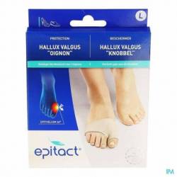 Epitact® heeft een hallux valgus bescherming ontwikkeld die bestaat uit een gelkussentje van Epithelium 26® waardoor de druk en de wrijvingen ter hoogte van de "knobbel" beperkt worden. Op deze manier wordt de pijn verlicht en de vorming van eelt vermeden.