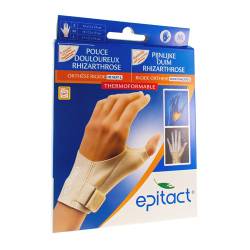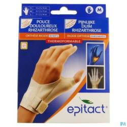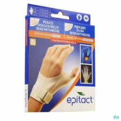 Werking:De EPITACT® orthese houdt de duim in rustpositie door de ruimte tussen de wijsvinger en de duim te openen. Doordat de beentjes in de goede positie worden gebracht, komt het carpo metacarpaal gewricht minder onder druk te staan, waardoor de pijn wordt verlicht.