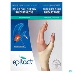 Het dragen van EPITACT® Proprioceptieve orthese overdag helpt bij het verlichten van gewrichtspijn geassocieerd met artrose van de duim (rhizarthrose). Het beperkt traumatische microbewegingen (beweging van de handen in de ruimte tijdens het lopen, spreken, enz.), Houdt de duim in de rustpositie en behoudt de lokale warmte bij het gewricht. Flexibel, dun en discreet, met deze orthese kunt u de volledige functionaliteit van uw hand behouden: u kunt rijden, schrijven, uw telefoon gebruiken ... en uw horloge of sieraden dragen!