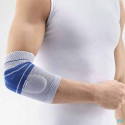 EpiTrain ontlast en stabiliseert de elleboog. Bij beweging masseert het compressiebreiwerk het zachte weefsel op aangename wijze. Hierdoor wordt over een groot oppervlak de doorbloeding gestimuleerd en worden de gewrichtstabiliserende spieren geactiveerd. Op deze manier vermindert de pijn en irritaties verdwijnen sneller. Twee visco-elastische pelotten ontlasten de pees- en spieraanhechtingen. Bij beweging hebben ze een masserend effect.