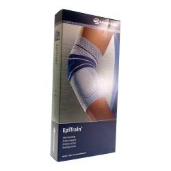 De EpiTrain actieve bandage ontlast en stabiliseert de elleboog. De gelijkmatige compressie van de bovenarm naar de elleboog tot aan de onderarm zorgt voor een betrouwbare ondersteuning. Bij beweging oefent de intermitterende compressie van het breiwerk een massage-effect uit. Dat bevordert in hoge mate de weefselstofwisseling. De omgeving wordt beter doorbloed, de pijn verzacht en irritaties kunnen sneller genezen. Tegelijkertijd worden de spieren gestimuleerd en de elleboog actief gestabiliseerd. Op lange termijn zorgt deze activering voor een verbeterde aansturing van de spieren en voorkomt verkeerde bewegingen. Twee visco-elastische pelotten bij de elleboog ter hoogte van het spaakbeen (radiaal) en de ellepijp (ulnair) zorgen voor de bescherming van de aanhechtingsplaats van de pees (epicondylus). Zij ontlasten de geïrriteerde pees- en spieraanhechtingen en masseren bij beweging ook het zachte weefsel. Daardoor wordt de pijnverlagende en spieractiverende werking van de bandage versterkt. Het ademende breiwerk van de EpiTrain voelt aangenaam aan op de huid. Door de bijzonder elastische randen van de bandage wordt de druk voorzichtig verdeeld en de bandage snoert niet in. De anatomische vorm garandeert een goede pasvorm en een hoog draagcomfort.