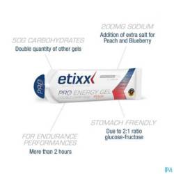 De Etixx PRO LINE Energy Gel bevat naast 200mg natrium ook 50 g multitransporteerbare koolhydraten in deze meest optimale 1:0.8 verhouding glucose:fructose en maakt dus optimaal gebruik van verschillende opnamekanalen en is daardoor ideaal voor duursporters die langdurig aan een hoge intensiteit presteren en streven naar een maximale koolhydraatinname tot 120g per uur.