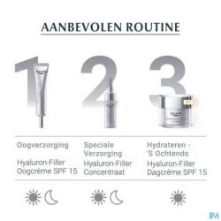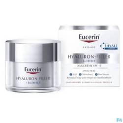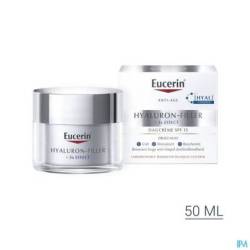 Eucerin Hyaluron-Filler Dagcrème voor de droge huid bevat een unieke combinatie van hyaluronzuur met korte en lange ketens om door te dringen in rimpels en deze van binnenuit op te vullen, evenals bioactief glycine-saponine om de huideigen natuurlijke aanmaak van hyaluronzuur verder te stimuleren, waarbij de huid meer vocht vasthoudt en rimpels van binnenuit glad worden gemaakt. SPF 15 met een UVA-bescherming voorkomen voortijdige veroudering en zelfs diepere rimpels. Creëert een uitstekende basis voor make-up.