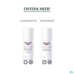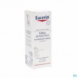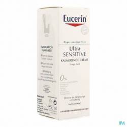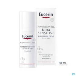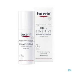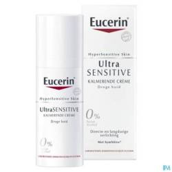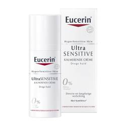 Eucerin UltraSENSITIVE Kalmerende Crème Droge huid wordt aanbevolen voor de overgevoelige huid waar het belangrijkste symptoom een onaangename huid is met een brandend, stekend gevoel of jeuk, maar zonder zichtbare tekenen van roodheid. Aangebracht na reiniging, kalmeert het direct en verzacht het de droge, overgevoelige huid van het gezicht, de hals en het decolleté en geeft langdurig comfort en bescherming aan de huid, terwijl speciale ingrediënten in de crème de huid verzachten en hydrateren.