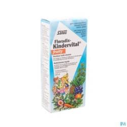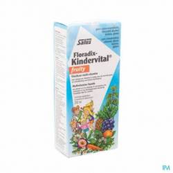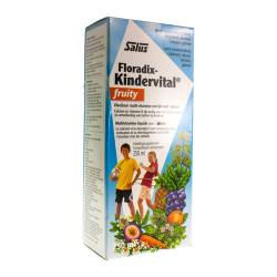 Wortel, brandnetel, spinazie, waterkers, koriander, kamille, anijszaad, perensap, sinaasappelsap, druivensap, acerolasap, rozenbottelextract, carobemeel en essence van cacao. Kindervital Fruity is alleen gezoet met het vruchtensap: er is dus geen suiker toegevoegd.