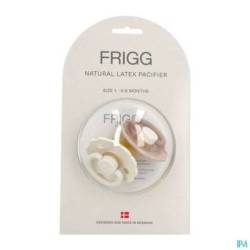 De Frigg fopspeen bestaat uit een latex speen met een gebogen schild.