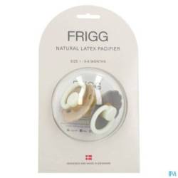 De Frigg fopspeen bestaat uit een latex speen met een gebogen schild.