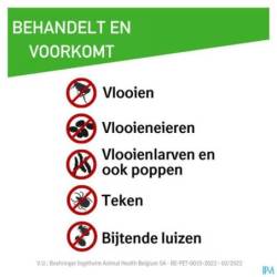 In afwezigheid van beschikbare gegevens, het diergeneesmiddel niet toedienen aan puppy's jonger dan8 weken oud.Niet gebruiken bij zieke (systemische ziekten, koorts) of herstellende dieren.Niet gebruiken bij konijnen, aangezien bijwerkingen en zelfs sterfte kunnen voorkomen.In afwezigheid van studies wordt het gebruik van dit diergeneesmiddel niet aanbevolen bij nietdoeldiersoorten.Dit diergeneesmiddel is specifiek ontwikkeld voor honden. Niet gebruiken bij katten en fretten, daardit tot overdosering kan leiden.