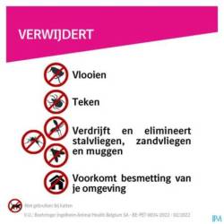 Stalvliegen: Weert (anti-voedende werking) en doodt stalvliegen (Stomoxys calcitrans) gedurende 5 weken.