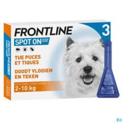 Frontline® Spot-On is een gemakkelijk aan te brengen vloeistof die uw hond goede bescherming tegen vlooien en teken biedt. Vlooien sterven binnen 24 uur, teken en bijtende luizen binnen 48 uur. Frontline® Spot-On beschermt uw hond 4 weken tegen teken en 4 weken tegen vlooien. Voor honden van 2kg tot 10kg.