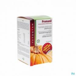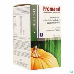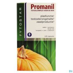 Fytostar Promanil is een totaalcomplex voor de man, met brandnetel, pompoenpitten en sabalvrucht; deze helpt als ondersteuning voor de plasfunctie. De plaspillen bevatten daarnaast zink, dat bijdraagt tot het behoud van een goed testosterongehalte in het bloed en selenium, dat bijdraagt tot het behoud van een gezonde zaadproductie. Bovendien is er vitamine B6 als ondersteuning voor de regulatie van de hormonale activiteit en vitamine E aan toegevoegd.