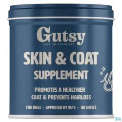 Het Gutsy Skin & Coat supplement voor honden heeft als doel te zorgen voor een glanzende vacht, tegen haaruitval en betere huidherstel. Het supplement is een soft chew dat gebruiksvriendelijk is en toegediend kan worden als een snoepje.