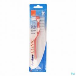 De Jordan Denture Brush beschikt over een ergonomische borstel met 2 koppen voor een meer effectieve reiniging. Een grote gebogen kop die overeenkomt met de vorm van kunstgebitten en een kleine borstelkop voor de moeilijk bereikbare plaatsen en de binnenkant van het kunstgebit .