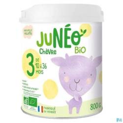 Junéo chèvre BIO 3ème âge is een biologische melkpoeder voor zuigelingen vanaf 10 maanden. Junéo chèvre wordt gemaakt in de Vendée met 39% volle geitenmelkpoeder van biologische boerderijen. Biologische landbouw sluit het gebruik van synthetische chemicaliën en GGO's in geitenvoer uit. Geitenmelk is een alternatief voor koemelk, met een andere samenstelling: de vetbolletjes zijn minder dicht en het caseïnegehalte is lager.