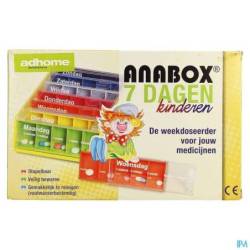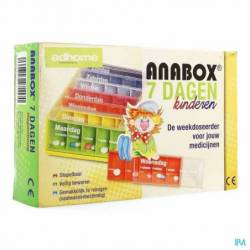 De weekdoos voor kinderen van Anabox bestaat uit 7 dagdoseerders die hun plaats vinden in een box. De dagdoseerders hebben een halfronde vorm waardoor de geneesmiddelen gemakkelijk uit te nemen zijn en er een makkelijke reiniging mogelijk is omdat er afgeronde hoeken zijn. De doseerders zijn gemakkelijk in en uit de box te plaatsen en blijven onder alle omstandigheden op hun plaats. Elke doseerder heeft 5 vakken waarbij het ochtend vak iets groter is dan de rest. Het 5de vak is een extra vak voor een eventuele reserve voorraad. Het toegepaste materiaal beschermt de geneesmiddelen tegen UV straling. Afkortingen in nl of fr. Kleuren kunnen vari'ren. Technische info: ¥ 18,2 x 11,9 x 4,9 cm ¥ elk vakje: 34 x 20 x 20 cm