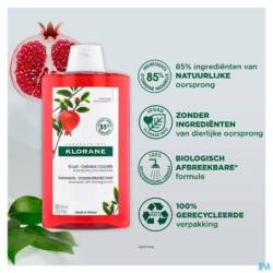 De Shampoo met Granaatappel reinigt gekleurd haar op milde wijze, fixeert de kleur en behoudt de natuurlijke glans tot 8 weken*. Deze veganistische**** en zintuiglijke shampoo met hoge tolerantie is verrijkt met extract van Granaatappelschors, een echte kleurbeschermer***. Dit actieve bestanddeel, dat rijk is aan tannines (natuurlijke antioxidanten), vangt en fixeert pigmenten op de keratine om kleurvervaging te beperken, terwijl het beschermt tegen schadelijke invloeden van buitenaf en geleidelijke dofheid. Het haar is gevoed, zacht en glanzend, de kleur is gerevitaliseerd en straalt, en het haar ruikt heerlijk. De Shampoo met Granaatappel heeft een biologisch afbreekbarefomule** en bevat 85% ingrediënten van natuurlijke oorsprong. Het bevat geen sulfaathoudende tensioactieve stoffen of siliconen en is verpakt in een ecologische verpakking (100% gerecycleerd en recycleerbaar plastic).