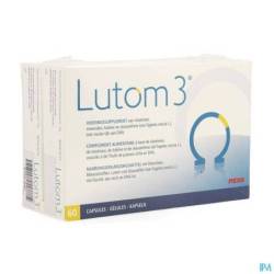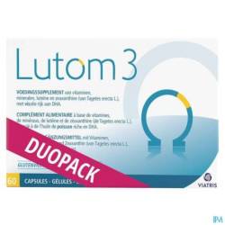 LUTOM 3 is een voedingssupplement dat bestaat uit een ratione-le combinatie van luteïne en zeaxanthine (van Tagetes erecta L.), met visolie rijk aan meervoudig onverzadigde omega-3-vetzuren (EPA + DHA), vitamines, zink en koper. Luteïne en zeaxanthine (van Tagetes erecta L.) zijn stoffen die het menselijke lichaam niet kan omzetten, maar die worden geabsorbeerd door de voeding door hun aanwezigheid in de natuur, met name in groene blad-groenten. Zodra luteïne en zeaxanthine in het lichaam geabsorbeerd zijn, worden ze verdeeld over de weefels, met name van de ogen, waar ze worden gedeponeerd in het netvlies, voornamelijk ter hoogte van de macula (gele vlek). De omega-3-vetzuren zijn zogenaamde "essentiële" stoffen, omdat het lichaam deze niet zelf kan omzetten. In de ogen worden deze stoffen selectief en mogelijk in het netvliesweefsel gedeponeerd. Omega-3 (DHA) dragen bij tot de instandhouding van een normaal gezichtsvermogen.