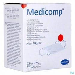Non-woven kompres met gaasstructuur van 70% viscose en 30% polyestervezels; vrij van bindmiddelen en optische witmakers; zeer absorberend, zacht en luchtdoorlatend; beschikbaar in verschillende lagen, steriel en niet-steriel.