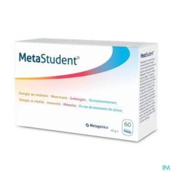 MetaStudent® ondersteunt het normale energieniveau (vit. B1, B2, B3, B5, B6, B12), en draagt bij tot een normale werking van het immuunsysteem (vit. C, D, zink, selenium). MetaStudent® draagt bij tot een normale cognitieve functie (jodium, zink) en tot een normaal leervermogen en geheugen (Panax ginseng-extract). Daarnaast bevat MetaStudent® ook nutriënten te gebruiken bij stressmomenten (folaat) en vermoeidheid (folaat, magnesium, vit. B6, B12, guarana-extract).