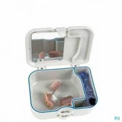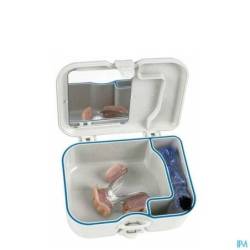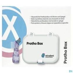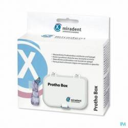 De Protho Box van Miradent is een handig opbergdoosje van stevig plastic voor je kunstgebit of beugel, voorzien van een ergonomische mini-protheseborstel. Het praktische is dat de box volledig waterdicht is. Daardoor kan het kunstgebit of beugel in een reinigingsvloeistof worden bewaard, zonder lekken. Hierbij vind je een ergonomisch gevormde mini-protheseborstel (ook los verkrijgbaar). Met de witte borstel kan de buitenkant van de prothese worden schoongemaakt en met de zwarte borstel kan de binnenkant worden gereinigd.