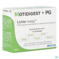 Motidigest PG bevordert op natuurlijke wijze de spijsvertering.Verhoogt de gastro-intestinale weerstand tegen onwel gevoel en zware maag.