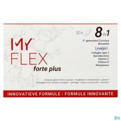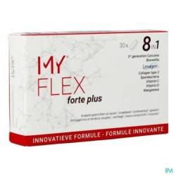 De innovatieve en zeer complete 8-in-1 formule MY®FLEX forte plus bevat curcuma extract, boswellia extract, palmitoylethanolamide (PEA), ongedenatureerd collageen type 2 en sporenvormende bacteriën aangevuld met vitamine C, vitamine D en mangaan. Curcuma en boswellia dragen bij tot soepele gewrichten. Vitamine C ondersteunt het kraakbeen. Mangaan ondersteunt het bindweefsel en vitamine D ondersteunt de spieren.