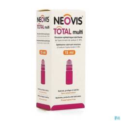 NEOVIS TOTAL multi is een bevochtigende oogoplossing die wordt aangeboden in de vorm van een steriele hypo-osmolaire emulsie met 0,189s natriumhyaluronaat Iverkregen door middel van fermentatie]. NE0VIS%* TOTAL multi bevat geen bewaarmiddel en is verkrijgbaar in een multidosisflesje van 15 ml.