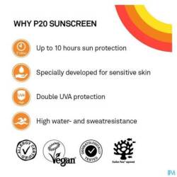 P20 Sensitive Face IP50+ is een zonnecrème met een lichte textuur, speciaal ontwikkeld voor het gezicht en de hals. De crème helpt de huid te beschermen tegen door de zon veroorzaakte veroudering (fotoveroudering) en is geschikt voor de gevoelige huid. Sensitive face bevat Triple Protection technologie die tot 10 uur bescherming biedt en een hoge UVA-bescherming bevat. De crème is dermatologisch getest voor de gevoelige huid, bevat geen parfum en is veganistisch.