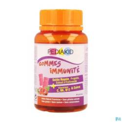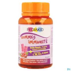 De Immunity Gums PEDIAKID®bevatten natuurlijke actieve ingrediënten die streng geselecteerd zijn vanwege hun erkende eigenschappen en hun zachte werking om alle afweermechanismen van het lichaam te ondersteunen. Aanbevolen voor de seizoenswisseling, een periode die bevorderlijk is voor verkoudheid, zijn ze gemaakt van een complex van Royal Jelly, Echinacea-extract, Propolisextract, vitaminen en mineralen om enerzijds bij te dragen aan de normale werking van het immuunsysteem (Echinacea-extract, vitamine C, B6, B12, koper) en anderzijds de afweer van het lichaam te ondersteunen (Echinacea-extract).