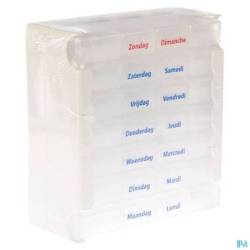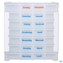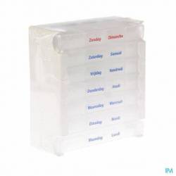 Pillendoos met clicksysteem. Deze pillendoos heeft 7 dagboxen voor iedere dag van de week. Iedere dagbox heeft 4 vakken -ochtend-middag-avond-nacht