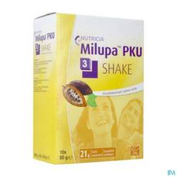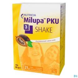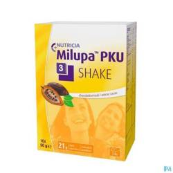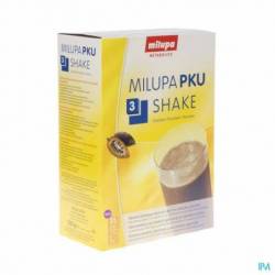 Milupa PKU 3-shake is een poedervormig aminozuurmengsel met koolhydraten en vet, vitaminen, mineralen en spoorelementen. Milupa PKU 3-shake bevat sporen van fenylalanine uit natuurlijke ingrediënten. Sinaasappelsmaak bevat 2,5 mg phe per zakje en chocoladesmaak bevat 15 mg phe per zakje.