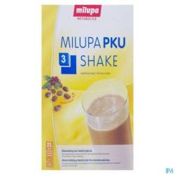 Milupa PKU 3-shake is een poedervormig aminozuurmengsel met koolhydraten en vet, vitaminen, mineralen en spoorelementen. Milupa PKU 3-shake bevat sporen van fenylalanine uit natuurlijke ingrediënten. Sinaasappelsmaak bevat 2,5 mg phe per zakje en chocoladesmaak bevat 15 mg phe per zakje.