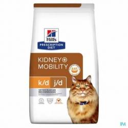 Hill's Prescription Diet k/d + Mobility Kattenvoer met Kip is een volledig dieetvoeder voor de ondersteuning van de nierfunctie bij chronische of tijdelijke nierinsufficiëntie en voor de ondersteuning van het metabolisme van de gewrichten in geval van osteoartritis bij volwassen katten. Dit voeder heeft een laag fosforgehalte, een beperkt eiwitgehalte, maar bevat hoogwaardige eiwitten, een hoog gehalte aan DHA en totaal omega 3-vetzuren, een verhoogd gehalte aan methionine en mangaan en een adequaat gehalte aan vitamine E.