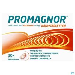 Promagnor® Kauwtabletten is een hoog gedoseerd magnesiumsupplement (450 mg). Dankzij de hoge dosering volstaat 1 kauwtablet Promagnor® per dag. Magnesium draagt bij tot een normaal energetisch metabolisme en vermindering van vermoeidheid en een normale spier- en zenuwfunctie. Promagnor is beschikbaar in 5 vormen: capsules, zakjes, instant, kauwtabletten en bruistabletten.