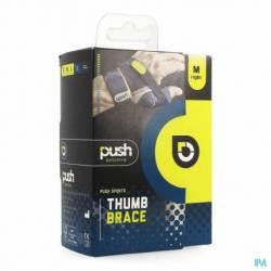 De Push Sports Duimbrace biedt uitkomst bij aanhoudende pijn aan de duim als gevolg van overstrekking van het middelste duimgewricht (MCP-1) door bijvoorbeeld een bal- of skiongeval. De duimbrace stabiliseert het gewricht waardoor de betreffende gewrichtsbanden de kans krijgen om te genezen. Het duimkapje beschermt de pijnlijke duim tegen impact van bijvoorbeeld een bal. De banden aan de brace zijn individueel instelbaar zodat de gebruiker zelf kan bepalen in hoeverre de strekbeweging van de duim beperkt dient te worden. Tevens ondervangen de banden de speling die door beschadiging van de gewrichtsbanden is ontstaan. Het bandsysteem verloopt kruislings en biedt zijwaartse ondersteuning aan het middelste duimgewricht. De overige duimgewrichten en de pols behouden hun bewegingsvrijheid. De duimbrace houdt de handpalm vrij en past goed onder een keepers- of skihandschoen. INDICATIES