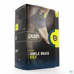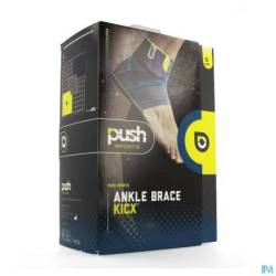 De Push Sports Enkelbrace Kicx biedt de best mogelijke bescherming tegen enkelverzwikking tijdens het sporten. Zowel bij trainingshervatting als ter preventie van terugkerend enkelletsel bij enkelinstabiliteit is de Push Sports Kicx uitermate geschikt. De functionele banden die kruisen aan de buitenzijde van de enkel zorgen voor een effectieve inversiebeperking. De banden zijn verankerd aan de verstevigde binnenzijde van de brace en verlopen op anatomisch verantwoorde wijze naar de buitenzijde van de enkel. Bij het naar binnen kantelen van de voet komen de banden op spanning en voorkomen dat de enkel verzwikt. Sporten blijft gewoon mogelijk, de Push Sports Kicx staat plantair- en dorsaalflexie in het enkelgewricht namelijk toe. Het hoogwaardige elastische materiaal sluit nauw aan op de anatomie van de enkel en biedt een aangename druk rond het gewricht. De brace is ultradun en past dus perfect in slanke sportschoenen. Voor optimaal draagcomfort kan de brace over een dunne sok gedragen worden. Voor een goede functie dient de Push Sports Kicx altijd in combinatie met een schoen gedragen te worden. PROPHY-X Preventief 'Prophy-X' bandsysteem aan de buitenzijde van het enkelgewricht met 2 elkaar kruisende banden. De dorsale (achterste) Prophy-X band staat haaks op de inversie/eversie rotatie-as en voorkomt het naar binnen kantelen (verzwikken) van de voet. De ventrale (voorste) Prophy-X band biedt tegenwicht en weerstaat de kracht die op de dorsale band wordt uitgeoefend. De Prophy-X banden kruisen elkaar in de rotatie-as van het bovenste spronggewricht waardoor het afrollen van de voet niet wordt gehinderd. INDICATIES