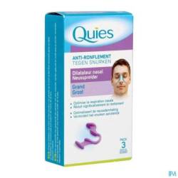 Met de Quies neusverwijder kunnen de neusgaten van de snurker lichtjes verwijd worden zodat de luchtdoorstroming gemakkelijker wordt en de ademhaling door de mond, die vaak samengaat met snurken, wordt vermeden. Eenvoudig te gebruiken, herbruikbaar gedurende 3 maanden. Verkrijgbaar in klein/gemiddeld en groot formaat. Vanaf 12 jaar oud. Deze medische hulpmiddelen zijn gereglementeerde gezondheidsproducten die in het kader van deze verordening van het CE-merkteken zijn voorzien. Lees de instructies zorgvuldig. Vraag uw apotheker om advies.
